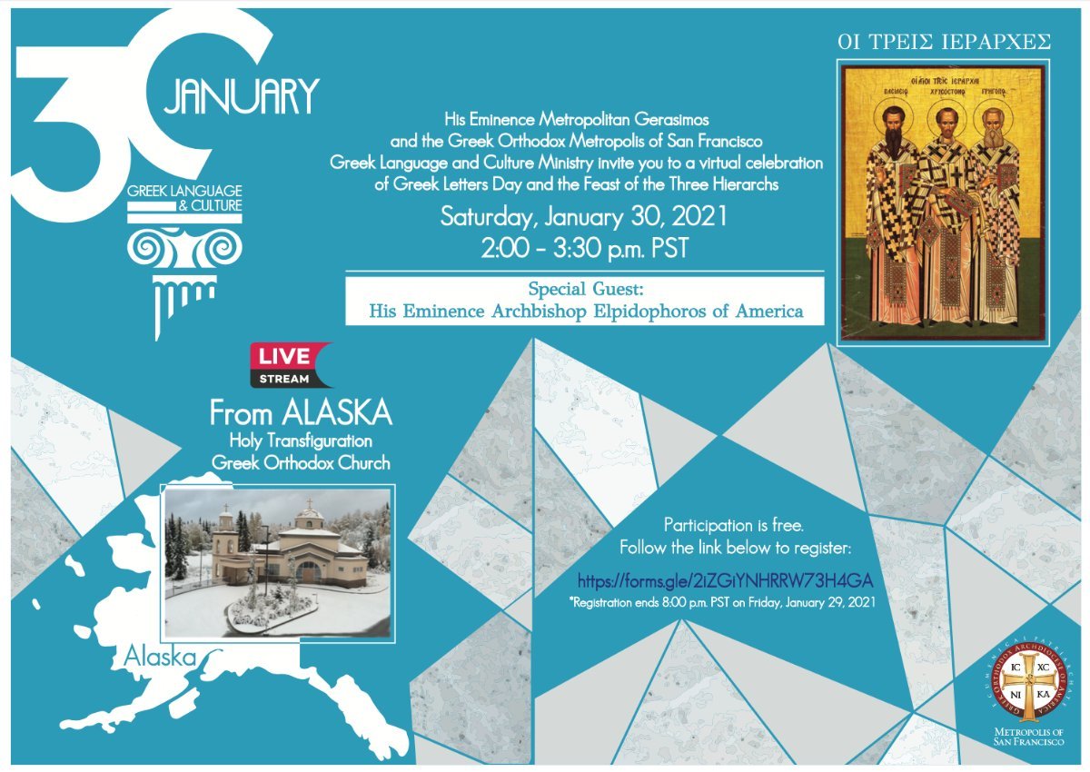 Με τις ευλογίες του Μητροπολίτη Σαν Φρανσίσκο κ. Γερασίμου, η Υπηρεσία Ελληνικής Γλώσσας και Πολιτισμού της Μητρόπολης διοργανώνει μια διαδικτυακή εορτή για την Ημέρα Ελληνικών Γραμμάτων, τιμώντας έτσι τους Τρεις Ιεράρχες.
