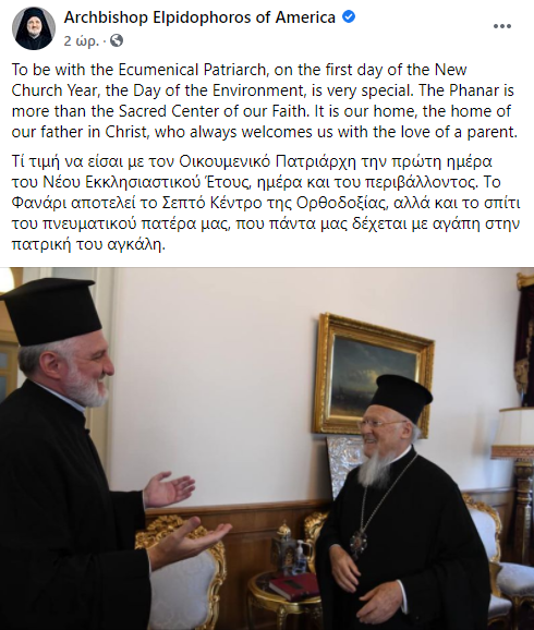 Στη συνάντηση που είχε με τον Παναγιώτατο Οικουμενικό Πατριάρχη κ.κ. Βαρθολομαίο αναφέρθηκε με ανα΄ρτησή του σε μέσο κοινωνικής δικτύωσης ο Σεβ. Αρχιεπίσκοπος Αμερικής κ. Ελπιδοφόρος.