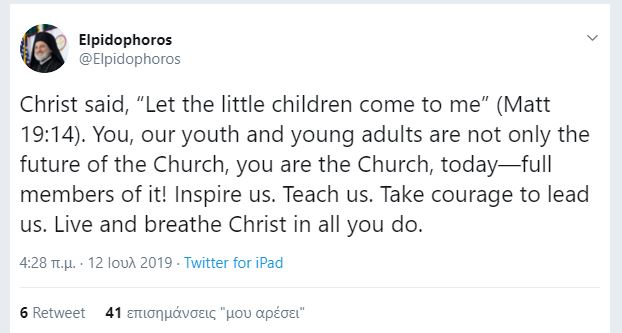 Τέλος σε άλλο μήνυμά του ο Αρχιεπίσκοπος Ελπιδοφόρος καλεί τους νέους στην Εκκλησία: ”
