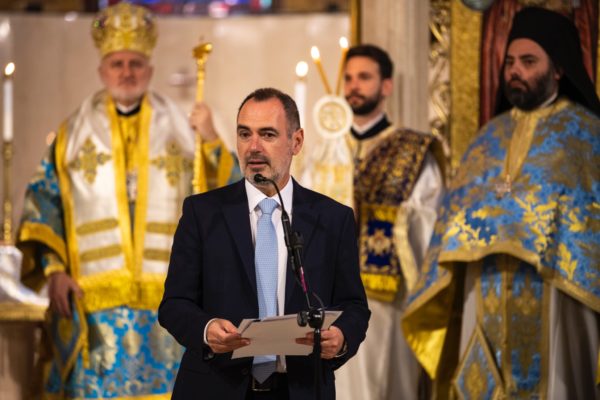 Καθώς ετοιμαζόμαστε να ψάλλουμε τη δοξολογία μας, βλέπουμε αυτούς τους ηρωικούς Εύζωνες να στέκονται μπροστά μας και να ευχαριστούν για την ανεξαρτησία της Ελλάδας, που αποτελεί μια ελευθερία που έχει προικίσει εμάς και τον κόσμο με μια τεράστια πολιτιστική κληρονομιά, φιλοσοφίας, γλώσσας, τέχνης και πολλών άλλων. Τα χαρίσματα αυτά βαφτίστηκαν από τους Χριστιανούς προγόνους μας, για να γίνουν η δόξα του Βυζαντίου, δηλαδή μια δόξα που ζει στο πνεύμα και τη διακονία του Οικουμενικού Πατριαρχείου Κωνσταντινουπόλεως. Και αυτοί οι Εύζωνες εδώ σήμερα, μας υπενθυμίζουν πως πρέπει να είμαστε οι πυλώνες της πίστης μας τόσο όσο εκείνοι είναι οι στέρεοι πυλώνες, που στέκονται στον οίκο του Θεού μας, όπως υπόσχεται το βιβλίο της Αποκάλυψης: