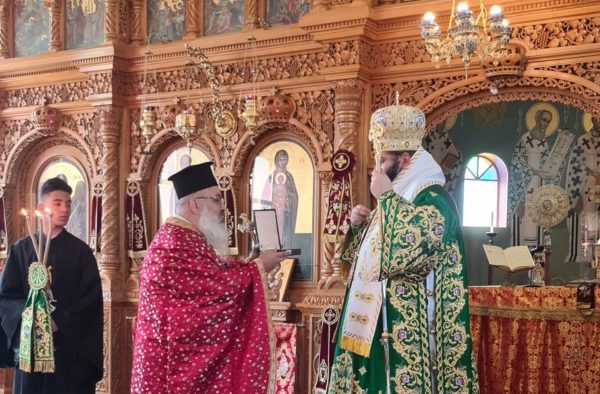 Στο τέλος της Θείας Λειτουργίας, ο π. Πέτρος καλωσόρισε τον Θεοφιλέστατο, τονίζοντας την αξία του ότι η Καμπέρα απέκτησε Επίσκοπο, ενώ του χάρισε δύο δώρα εκ μέρους της Ενορίας.
