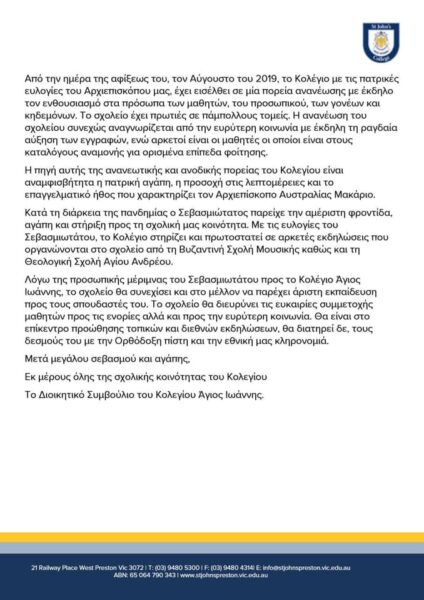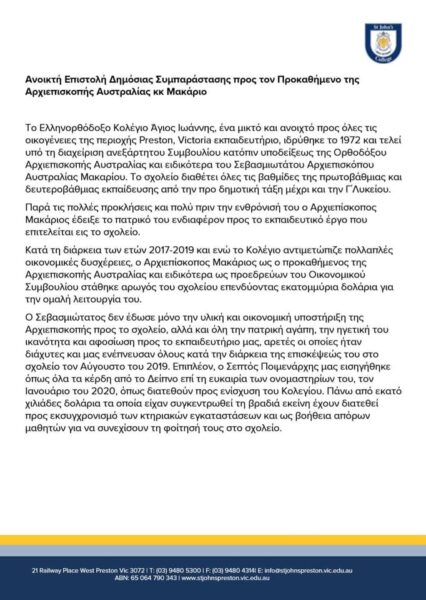 Ανοικτή Επιστολή Δημόσιας Συμπαράστασης στον Αρχιεπίσκοπο Αυστραλίας κ. Μακάριο δημοσίευσε το Ελληνορθόδοξο Κολέγιο Άγιος Ιωάννης από το Πρέστον που ιδρύθηκε το 1972. “Ο Σεβασμιώτατος δεν έδωσε μόνο την υλική και οικονομική υποστήριξη της Αρχιεπισκοπής προς το σχολείο, αλλά και όλη την πατρική αγάπη, την ηγετική του ικανότητα και αφοσίωση προς το εκπαιδευτήριο μας, αρετές οι οποίες ήταν διάχυτες και μας ενέπνευσαν όλους κατά την διάρκεια της επισκέψεώς του στο σχολείο” τονίζεται στην επιστολή.