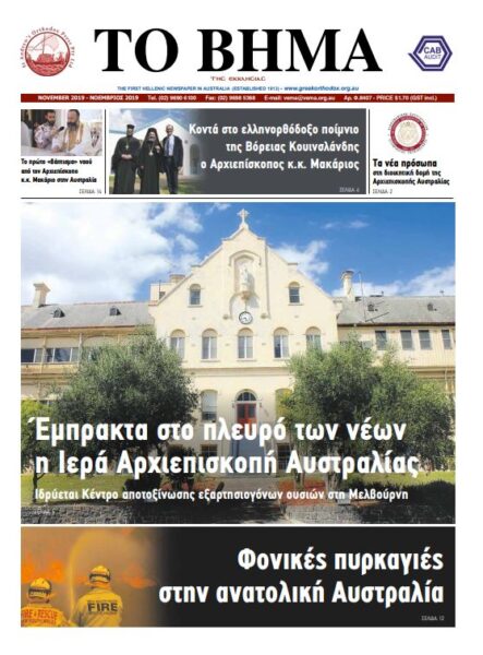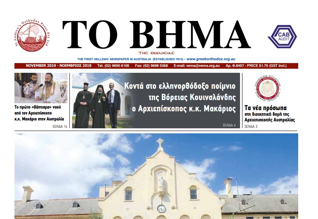 Αρχιεπισκοπή Αυστραλίας 18 Νοεμβρίου, 2019 Αρχιεπισκοπή Αυστραλίας: Διαβάστε “ΤΟ ΒΗΜΑ” – Νοέμβριος 2019 Διαδώστε: ΔΙΑΒΑΣΤΕ ΕΔΩ ΑΝΑΛΥΤΙΚΑ το Ομογενειακό, Αυστραλιανό “ΒΗΜΑ” της Εκκλησίας, μηνός Νοεμβρίου 2019. Διαδώστε: