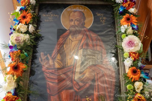 Επιπλέον, ο Σεβασμιώτατος αναφέρθηκε στους τιμώμενους Αγίους, τους Πρωτοκορυφαίους Αποστόλους Πέτρο και Παύλο, σημειώνοντας καταρχάς τους λόγους που η Εκκλησία μας έχει θεσπίσει τον κοινό εορτασμό της μνήμης τους. Ο πρώτος λόγος, όπως εξήγησε, είναι ότι εκοιμήθησαν την ίδια ημέρα, με διαφορά ενός έτους, ενώ για τον δεύτερο και ουσιαστικότερο λόγο παρέπεμψε στο ιδιόμελο στιχηρό του Εσπερινού της εορτής, όπου ψάλλουμε: «…τους διηρημένους τοις σώμασι, και ηνωμένους τω Πνεύματι…». Πράγματι, όπως επισήμανε ο Αρχιεπίσκοπος, οι δύο Απόστολοι είχαν κοινή πορεία και προσφορά, όσο και κοινό πνεύμα κατά τη διδασκαλία και διάδοση του Ευαγγελίου στα έθνη.