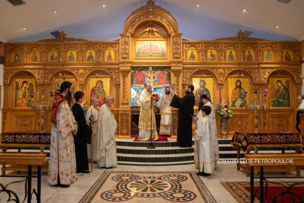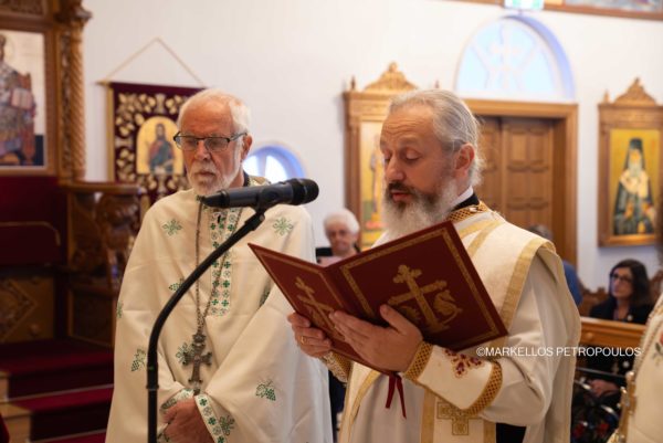 Στην κατάμεστη εκκλησία, ο Σεβασμιώτατος χοροστάτησε στην Ακολουθία του Όρθρου και προεξήρχε της Θείας Λειτουργίας, πλαισιούμενος από τον Θεοφιλέστατο Επίσκοπο Χαριούπολεως κ. Βαρθολομαίο, Αρχιεπισκοπικό Επίτροπο Βρισβάνης, τον π. Ιωάννη Καπέτα και τον Ιερατικώς Προϊστάμενο της Ενορίας, π. Σωτήριο Παπαφιλόπουλο.