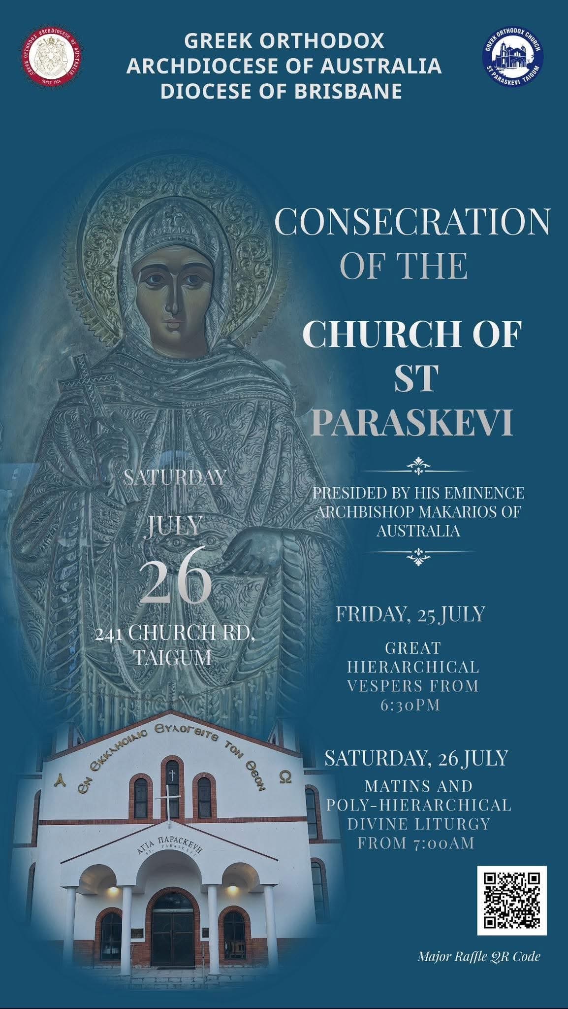 Το ερχόμενο Σάββατο, 26 Ιουλίου, ημέρα εορτασμού της μνήμης της Αγίας Μεγαλομάρτυρος Παρασκευής, θα τελεστούν τα Εγκαίνια του ομώνυμου Ιερού Ναού στη Βρισβάνη (241 Church Road Taigum), υπό του Σεβασμιωτάτου Αρχιεπισκόπου Αυστραλίας κ. Μακαρίου.