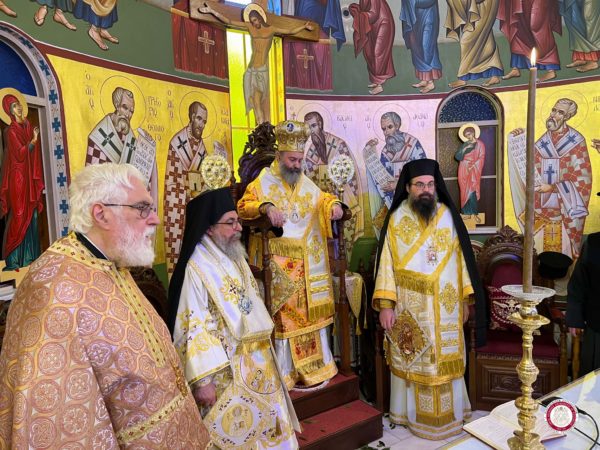 Μετά την Ακολουθία των Εγκαινίων, τελέστηκε η πρώτη Πανηγυρική Θεία Λειτουργία επί της εγκαινιασθείσης Αγίας Τραπέζης, όπου προεξήρχε ο Σεβασμιώτατος κ.κ. Μακάριος, συλλειτουργούντων των Θεοφιλεστάτων κ. Κυριακού και Ευμενίου.