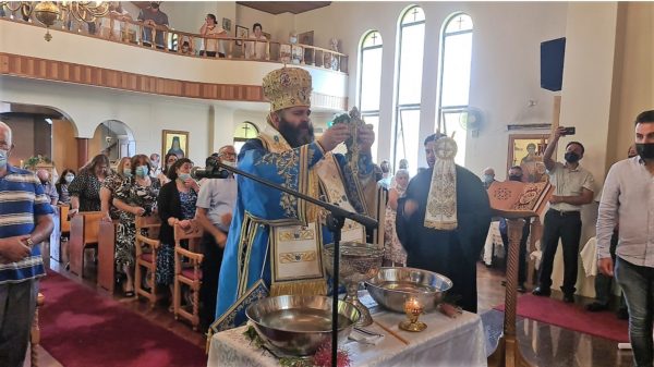 Στο τέλος της Θείας Λειτουργίας, ο Επίσκοπος Χαριουπόλεως τέλεσε την Ακολουθία του Μεγάλου Αγιασμού και μετέφερε στους πιστούς την αγάπη και τις καλύτερες ευχές του Σεβασμιωτάτου κ. Μακαρίου. Επιπλέον, μίλησε για την αγιογράφηση που γίνεται στον Ιερό Ναό και τη σημασία της υποστήριξης ενός τέτοιου έργου.