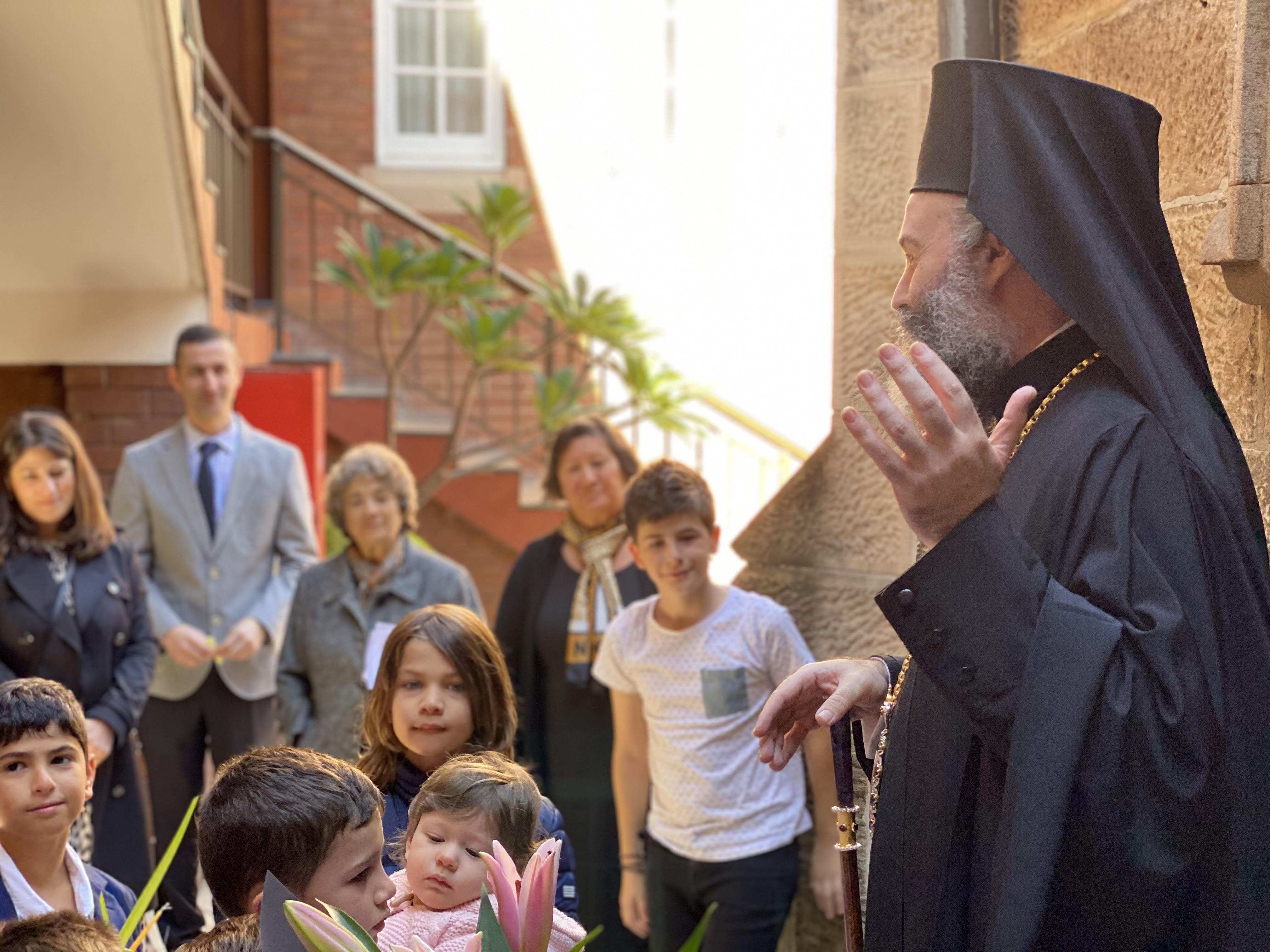 Στο τέλος της Θείας Λειτουργίας ο Σεβασμιώτατος μοίρασε τα βάια, και εν συνεχεία δέχθηκε τις ευχές των μικρών παιδιών του Κατηχητικού Σχολείου, τα οποία του πρόσφεραν λουλούδια και κόκκινα αυγά για το Πάσχα.