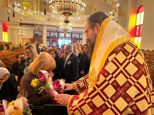Ο Θεοφιλέστατος μοίρασε άνθη σε όλες της γυναίκες, εκ μέρους του Σεβασμιωτάτου Αρχιεπισκόπου, και τις κάλεσε όλες για μια αναμνηστική φωτογραφία.