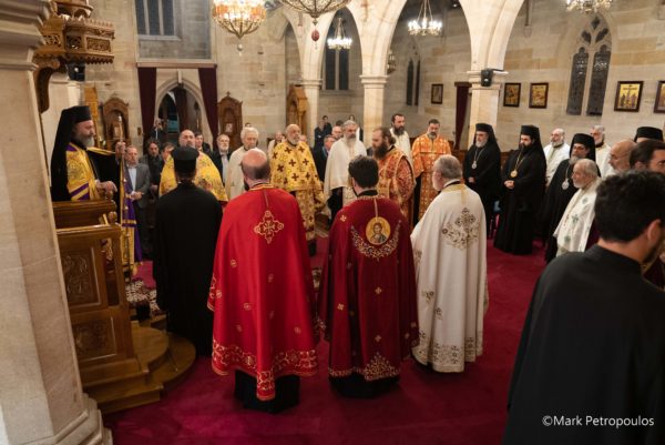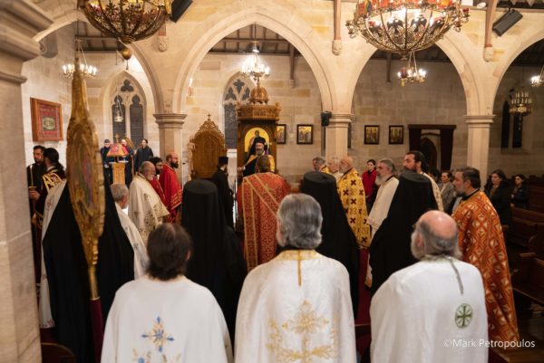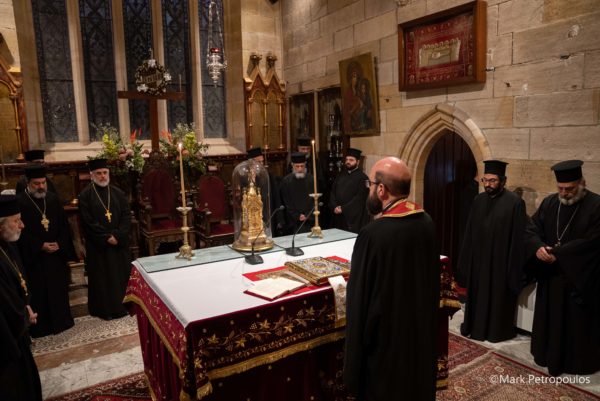 Ο Σεβασμιώτατος χοροστάτησε στον Εσπερινό πλαισιούμενος από τους Θεοφιλεστάτους Επισκόπους Μιλητουπόλεως κ. Ιάκωβο, Μελόης κ. Αιμιλιανό, Σωζοπόλεως κ. Κυριακό, Κερασούντος κ. Ευμένιο και Χαριουπόλεως κ. Βαρθολομαίο, καθώς επίσης από τον Πρωτοσύγκελλο της Ιεράς Αρχιεπισκοπής, Πανοσιολογιώτατο Αρχιμανδρίτη του Οικουμενικού Θρόνου κ. Χριστοφόρο Κρικέλη, και από πολλούς κληρικούς από όλη την Αυστραλία.