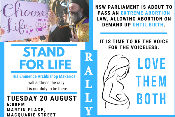 Η Αρχιεπισκοπή Αυστραλίας, κατά την Τρίτη 20 Αυγούστου 2019, στον απαραίτητο αγώνα κατά της “σκληρής” νομοθεσίας και νομοθετικών ρυθμίσεων που αφορούν τις εκτρώσεις και υπέρ του δικαιώματος στη ΖΩΗ – His Eminence Archbishop Makarios, Primate of the Greek Orthodox Church of Australia, to address STAND FOR LIFE rally – this Tuesday August 20 at 6pm, Martin Place, Macquarie St.