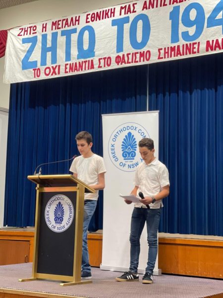 Οι μαθητές Εμμανουήλ Κασαδέλης και Αναστάσιος Μποζατζής, του Γυμνασίου της Κοινότητας στο Panania, παρουσίασαν «Το Ιστορικό της ημέρας στα Ελληνικά».