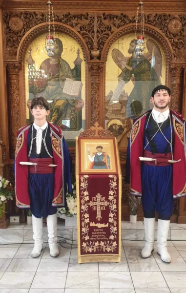 Οι πιστοί προσήλθαν στην εκκλησία με ευλάβεια για να προσκυνήσουν την εικόνα του Αγίου Νεομάρτυρος Ματθαίου και να λάβουν την ευλογία του, παρουσία των βρακοφόρων νέων Χρήστου Σταυρινίδη και Εμμανουήλ Αδαμάκη.