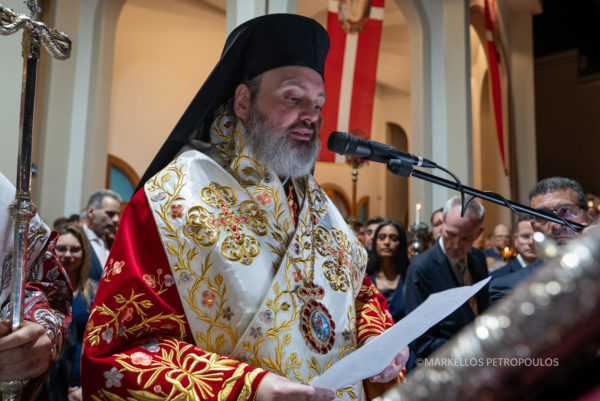 Μέσα σε αυτή τη βαθιά κατανυκτική ατμόσφαιρα, ανεγνώσθη η Πασχάλια Εγκύκλιος του Σεβασμιωτάτου κ.κ. Μακαρίου, στα Ελληνικά και στα Αγγλικά, από τους Θεοφιλεστάτους Επισκόπους Μιλητουπόλεως και Μαγνησίας αντιστοίχως. Ακολούθησε η Πανηγυρική Θεία Λειτουργία, της οποίας προεξήρχε ο Αρχιεπίσκοπος, με συλλειτουργούντες τους ως άνω Αρχιερείς και τους κληρικούς της πανηγυρίζουσας Ενορίας.