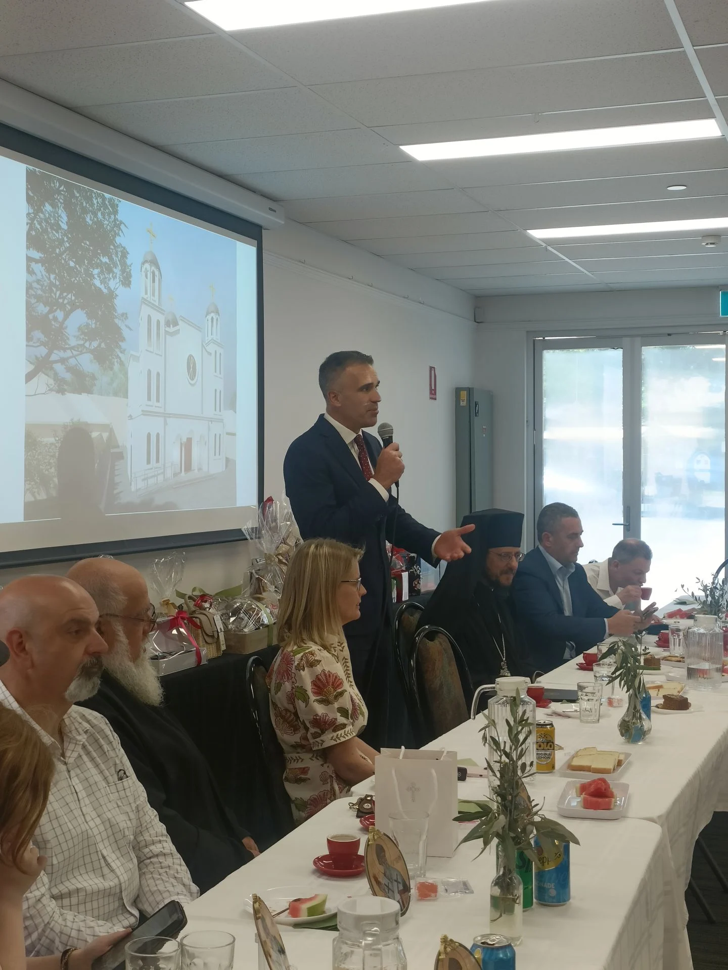 Μετά το πέρας της Θείας Λειτουργίας, οι κυρίες της ενοριακής Φιλοπτώχου Αδελφότητος παρέθεσαν πανηγυρική τράπεζα, η οποία συγκέντρωσε κληρικούς, ενορίτες και άλλους προσκυνητές, και εκλεκτούς προσκεκλημένους, σε κλίμα χαράς και αδελφικής κοινωνίας. Στην τράπεζα προσήλθε και ο Πρωθυπουργός της πολιτειακής Κυβερνήσεως Νοτίου Αυστραλίας κ. Peter Malinauskas, ο οποίος ανακοίνωσε ότι η Κυβέρνηση της Νοτίου Αυστραλίας θα συνεισφέρει το ποσό των 800.000 δολλαρίων για τα έργα επεκτάσεως και ανακαινίσεως του Ιερού Ναού του Αγίου Σπυρίδωνος, τα οποία πρόκειται να αρχίσουν το νέο έτος. Η γενναιόδωρη αυτή δέσμευση αποτελεί σημαντική ενίσχυση για την ενορία και έγινε δεκτή με ιδιαίτερο ενθουσιασμό και βαθύτατη ευγνωμοσύνη από τους πιστούς, διασφαλίζοντας ότι η Ενορία Αγίου Σπυρίδωνος Unley θα συνεχίσει να αποτελεί πνευματική εστία για τις ερχόμενες γενιές.