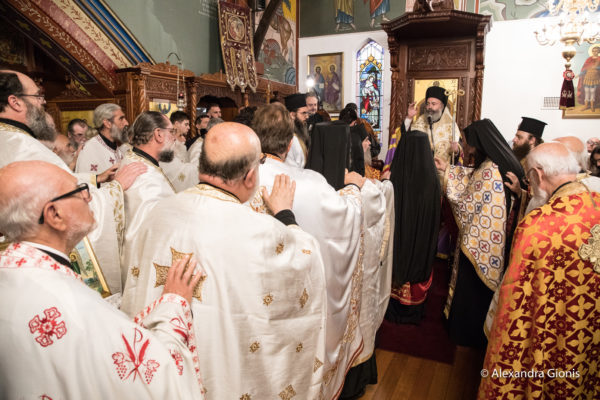 Στον Πανηγυρικό Εσπερινό παρέστησαν συμπροσευχόμενοι οι Σεβασμιώτατοι Μητροπολίτες Δέρβης κ. Ιεζεκιήλ, Νέας Ζηλανδίας κ. Μύρων και Ρεθύμνης και Αυλοποτάμου κ. Πρόδρομος, ο οποίος κήρυξε τον Θείο Λόγο κατόπιν παρακλήσεως του Αρχιεπισκόπου, καθώς επίσης οι Θεοφιλέστατοι Επίσκοποι Μελβούρνης κ. Κυριακός και Χώρας κ. Ευμένιος, και οι συνοδεύοντες τον Μητροπολίτη Ρεθύμνης, ΠανοσιολογιώτατοιΑρχιμανδρίτες κ. Βασίλειος Παπαδάκης, Ηγούμενος της Ιεράς Μονής Αγίας Αναστασίας της Ρωμαίας Ρεθύμνης, και κ. ΘεολόγοςΠαπαλεβυζάκης, Ηγουμενοσύμβουλος της Ιεράς Πατριαρχικής και Σταυροπηγιακής Μονής Αρκαδίου. Επίσης, μεταξύ των πιστών που κατέκλυσαν την εκκλησία, ήταν ο κ. Ιωάννης Χρυσουλάκης, πρώην Γενικός Γραμματέας Απόδημου Ελληνισμού και Δημόσιας Διπλωματίας του Υπουργείου Εξωτερικών της Ελλάδος.