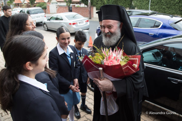 Η υποδοχή του Αρχιεπισκόπου έγινε σε κλίμα βαθειάς συγκινήσεως και με εκδηλώσεις αγάπης και σεβασμού από τους ευσεβείς ενορίτες. Στην είσοδο τον υποδέχθηκαν νέες και νέοι της Ενορίας, οι οποίοι του προσέφεραν μια ανθοδέσμη, ενώ με εγκάρδιους λόγους τον καλωσόρισαν ο Ιερατικώς Προϊστάμενος π. Κυριάκος Περιπετσάκης και ο κ. Βασίλειος Παπαστεργιάδης, Πρόεδρος της Ελληνικής Κοινότητας Μελβούρνης, στην οποία ανήκει ο Ι. Ναός. Αμφότεροι, υπογράμμισαν τον ιστορικό χαρακτήρα της επισκέψεωςτου Σεβασμιωτάτου και της Αρχιερατικής χοροστασίας στον εφετινό Πανηγυρικό Εσπερινό του Αγίου Ελευθερίου.