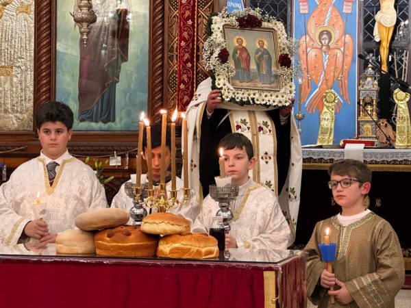 Ο Θεοφιλέστατος πλαισιώθηκε από τον Ιερατικώς Προϊστάμενο π. Σταύρο Κακαβά και άλλους κληρικούς της Αρχιεπισκοπικής Περιφέρειας. Πλήθος πιστών κατέκλυσε την εκκλησία για να τιμήσει τη μνήμη των προστατών της Ενορίας.
