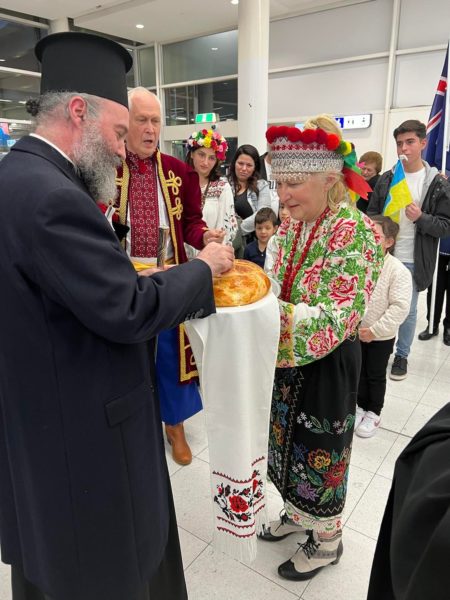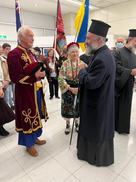 Στο αεροδρόμιο Kingsford του Σύδνεϋ, Ουκρανοί πιστοί με προεξάρχοντες τον π. Σάββα Πιζάνια, Προϊστάμενο της ουκρανικής Ενορίας του Αγίου Σάββα του εν Καλύμνω στο Σύδνεϋ, και τον κ. PeterDeriashnyj, Πρόεδρο της Ομοσπονδίας Ουκρανών Κοζάκων Αυστραλίας και Πρόεδρο της Ουκρανικής Ενορίας του Αγίου Βασιλείου στο Newcastle, περίμεναν τον Αρχιεπίσκοπο κατά την άφιξή του, για να του εκφράσουν την ευγνωμοσύνη τους που τους δέχθηκε κάτω από το ωμοφόριό του και την πνευματική του προστασία. Ήταν ντυμένοι με παραδοσιακές ενδυμασίες της Ουκρανίας, κρατούσαν την ουκρανική σημαία και τραγούδησαν ουκρανικά τραγούδια και εκκλησιαστικούς ύμνους, ενώ αναφωνούσαν συνεχώς «Άξιος».