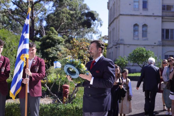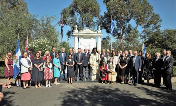 Στη συνέχεια έγινε κατάθεση στεφάνων στο μνημείο μπροστά από την κεντρική είσοδο της Ιεράς Μονής «Άξιον Εστί», σε μια τελετή που οργάνωσε το διοικητικό συμβούλιο και ο πρόεδρος της Πανελλήνιας Ένωσης Ελλήνων Αποστράτων και Εφέδρων στην Αυστραλία, κ. Παναγιώτης Δούρειος. Στο μνημόσυνο παρέστησαν η εκπρόσωπος του Ομοσπονδιακού Κοινοβουλίου της Αυστραλίας, βουλευτής του Εργατικού Κόμματος κ. Μαρία Βαμβακινού, η εκπρόσωπος του Πολιτειακού Κοινοβουλίου της Βικτώριας, βουλευτής του Εργατικού Κόμματος για την περιοχή του Northcote κ. Κατ. Θεοφάνους, ο Γενικός Πρόξενος της Ελλάδας στην Μελβούρνη κ. Εμμανουήλ Κακαβελάκης, ο πρόεδρος της Διακοινοτικής Επιτροπής ενοριών και κοινοτήτων Μελβούρνης και Βικτωρίας και πρόεδρος Οργανωτικής Επιτροπής Εθνικής Επετείου στη Βικτώρια κ. Αντώνης Τσουρδαλάκης, ο πρόεδρος της Ελληνικής Κοινότητας κ. Βασίλης Παπαστεργιάδης, ο πρόεδρος του Ελληνικού Παραρτήματος RSL Μελβούρνης (Hellenic RSL) κ. Μανώλης Καρβέλας, ο Αναπληρωτής Καθηγητής Δρ. Μαρίνης Πιρπιρής, εκπρόσωπος της Ελληνικής Ιατρικής Εταιρίας της Αυστραλίας, ο πρόεδρος της Παμμακεδονικής Ένωσης και του Συλλόγου Θεσσαλονικέων «Ο Λευκός Πύργος», κ. Παύλος Μαυρουδής, η πρόεδρος της Πρόνοιας κ. Χριστίνα Παυλίδη, η πρόεδρος της Αυστραλιανής Ομοσπονδίας Ποντιακών Σωματείων κ. Συμέλα Σταματοπούλου, ο πρόεδρος της Παναρκαδικής Ομοσπονδίας κ. Δημήτριος Αλεξόπουλος, η πρόεδρος του Συλλόγου Κριθιάς Αυστραλίας, κ. Χριστίνα Σταμπουλίδη, ο πρόεδρος του Παναρκαδικού Συλλόγου Μελβούρνης & Βικτωρίας «Ο Κολοκοτρώνης», κ. Γιάννης Δημητρόπουλος, ο πρόεδρος της Κρητικής Αδελφότητας κ. Μιλτιάδης Σταματάκος, ο πρόεδρος των συλλόγων ηλικιωμένων κ. Ιωάννης Κοστούλιας, ο πρόεδρος του Συλλόγου Χαλκιδικεων «Αριστοτέλης ο Σταγειριτης», κ. Λευτέρης Κούρτης, η γραμματέας της Κυπριακής Κοινότητας Μελβούρνης & Βικτωρίας, κ. Αναστασία Σαρακινη, η πρόεδρος της Συντονιστικής Επιτροπής Κυπριακού Αγώνα (Σ.Ε.Κ.Α) Μελβούρνης & Βικτωρίας, κ. Καίτη Γεωργίου, ο πρόεδρος της Παλλακωνικής Αδελφότητας Μελβούρνης & Βικτωρίας «Λεωνίδας» κ. Γιάννης Μαστρογιανακος, η εκπρόσωπος εκπαιδευτικών του σχολείου «Oakleigh Grammar», καθηγήτρια κ. Νατάσα Σπανού, με αντιπροσωπεία μαθητών, ο πρόεδρος της Φιλανθρωπικής Εταιρίας Νομού Καβάλας «Άγιος Σίλας», κ. Παναγιώτης Μάρκου, η Γραμματέας της Παγκρητίου κ. Μαρία Μανιού, και ο διευθυντής δημοσίων σχέσεων υποκαταστήματος της Bank of Sydney, κ. Σωτήρης Μάτης.