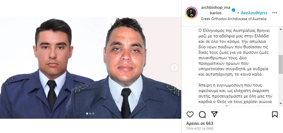 «Ο Ελληνισμός της Αυστραλίας θρηνεί μαζί με τα αδέλφια μας στην Ελλάδα και σε όλο τον κόσμο, την απώλεια δύο νέων παιδιών που θυσίασαν τις δικές τους ζωές για να σώσουν ζωές συνανθρώπων τους. Δύο πραγματικών ηρώων που υπηρετούσαν συνειδητά, με ανδρεία και αυταπάρνηση, το κοινό καλό», σημειώνει ο Σεβασμιώτατος για τον σμηναγό Χρήστο Μουλά και τον ανθυποσμηναγό Περικλή Στεφανίδη και καταλήγοντας επισημαίνει: