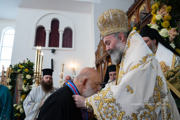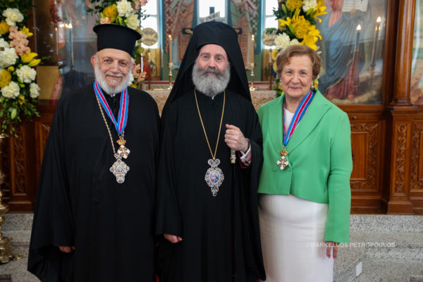 Στο τέλος της Πανηγυρικής Θείας Λειτουργίας, σε συγκινησιακά φορτισμένη ατμόσφαιρα, ο Αρχιεπίσκοπος κάλεσε κοντά του τον Ιερατικώς Προϊστάμενο του Αγίου Σπυρίδωνος, Πρωτοπρεσβύτερο του Οικουμενικού Θρόνου π. Στυλιανό, και την Πρεσβυτέρα του, Παναγιώτα, στους οποίους απένειμε την ανώτερη τιμητική διάκριση της Ιεράς Αρχιεπισκοπής, το Παράσημο του Τάγματος των Φιλοχρίστων. «Είναι το λιγότερο που μπορούμε να κάνουμε», σημείωσε κατά την προσφώνησή του ο Σεβασμιώτατος, μιλώντας με λόγους ευγνωμοσύνης για την πολυετή και πολύτιμη προσφορά τους στην Ενορία του Kingsford και συνολικότερα στην τοπική Εκκλησία της Αυστραλίας.