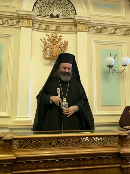 Τον Σεβασμιώτατο υποδέχθηκε στην επίσημη είσοδο του Κοινοβουλίου ο Πρόεδρος της Βουλής κ. Curtis Pitt, o οποίος τον οδήγησε στην αίθουσα δεξιώσεων, όπου ανέμεναν πολλοί βουλευτές, πρέσβεις επίσκοποι της Καθολικής και Αγγλικανικής Εκκλησίας και σημαίνοντα στελέχη της Ελληνικής Ομογένειας.
