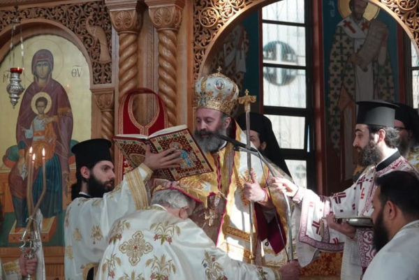 Στον Ιερό Ναό των Αγίων Ραφαήλ, Νικολάου και Ειρήνης, στο Λίβερπουλ του Σύδνεϋ, ιερούργησε το πρωί της Κυριακής, 16 Μαΐου, ο Σεβασμιώτατος Αρχιεπίσκοπος Αυστραλίας κ. Μακάριος. Ο Σεβασμιώτατος χοροστάτησε κατά τον Όρθρο και προεξήρχε της Θείας Λειτουργίας, πλαισιούμενος από τους Θεοφιλεστάτους Επισκόπου Μελόης κ. Αιμιλιανό και Κυανέων κ. Ελπίδιο.