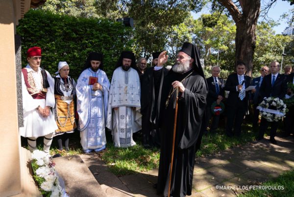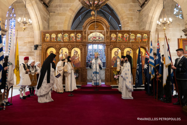 Ο Σεβασμιώτατος Αρχιεπίσκοπος Αυστραλίας κ. Μακάριος, ο οποίος χοροστάτησε στην Ακολουθία του Όρθρου και προεξήρχε της Αρχιερατικής Θείας Λειτουργίας, στη συνέχεια προέστη της Δοξολογίας επί τη Επετείω του «ΟΧΙ», πλαισιούμενος από τον Πρωτοσύγκελλο της Ιεράς Αρχιεπισκοπής, Πανοσιολογιώτατο Αρχιμανδρίτη του Οικουμενικού Θρόνου κ. Χριστοφόρο Κρικέλη, και από άλλους κληρικούς της τοπικής Εκκλησίας, ενώ στο μήνυμά του τόνισε, για μία ακόμη φορά, την ανάγκη «να διατηρηθεί άσβεστη η μνήμη της εθνικής μας εποποιίας στις νεότερες γενιές, που είναι το παρόν και το μέλλον του Γένους μας».