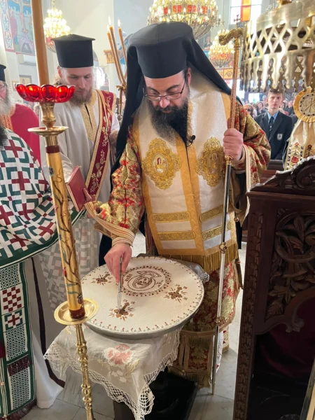 Ο Θεοφιλέστατος διαβίβασε στους πιστούς τις ευχές και ευλογίες του Σεβασμιωτάτου Αρχιεπισκόπου κ. Μακαρίου, ενώ κατά το κήρυγμά του αναφέρθηκε στη ζωή της Αγίας και συγκεκριμένα εστίασε σε δυο σημεία: