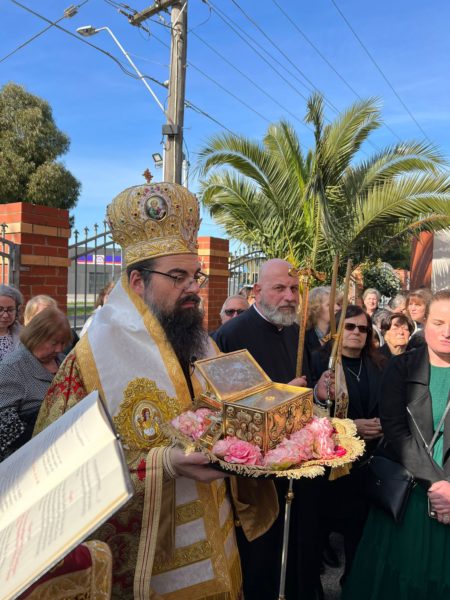 Τον Σεβασμιώτατο Αρχιεπίσκοπο Αυστραλίας κ. Μακάριο εκπροσώπησε ο Θεοφιλέστατος Επίσκοπος Κερασούντος κ. Ευμένιος, Αρχιεπισκοπικός Επίτροπος Northcote, ο οποίος χοροστάτησε στον πανηγυρικό Εσπερινό την παραμονή της εορτής, καθώς επίσης στον Όρθρο την κυριώνυμο ημέρα, και προεξήρχε της πανηγυρικής Θείας Λειτουργίας.