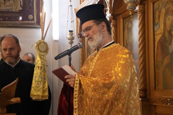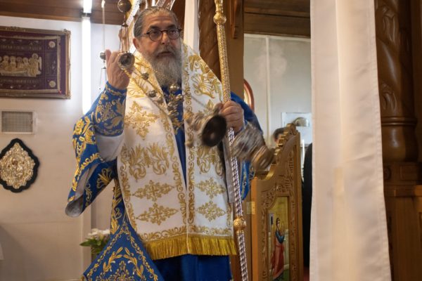 Τον Θεοφιλέστατο πλαισίωσε κατά τη Θεία Λειτουργία ο Ιερατικώς Προϊστάμενος του Ιερού Ναού, π. Ιωάννης Αδάμ, ο οποίος τον ευχαρίστησε εγκάρδια για την επίσκεψή του.