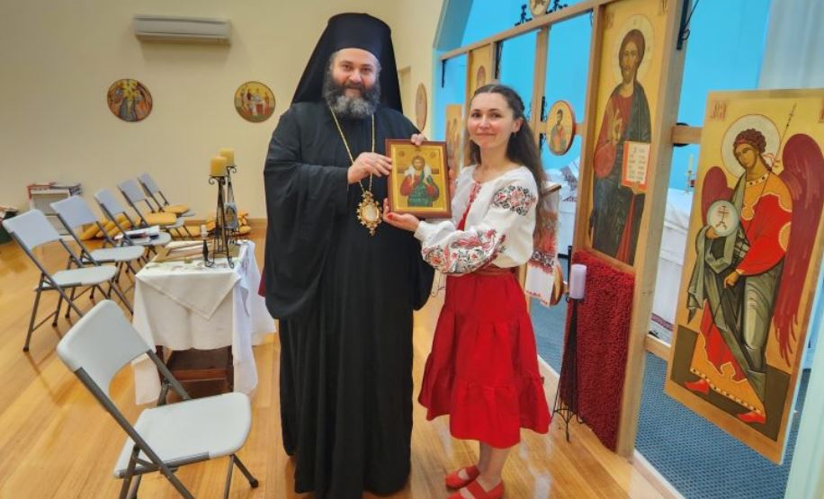 Ο Επίσκοπος Χαριουπόλεως προσέφερε στην Πρόεδρο του Ουκρανικού Συλλόγου, κ. Tania Tkachuk, μία εικόνα του Χριστού, με την προσευχή να φέρει ο Θεός ειρήνη στην πατρίδα της.