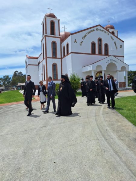 Ο Θεοφιλέστατος Επίσκοπος Βρισβάνης κ. Βαρθολομαίος τον υποδέχθηκε εκ μέρους του Σεβασμιωτάτου Αρχιεπισκόπου Αυστραλίας κ. Μακαρίου.