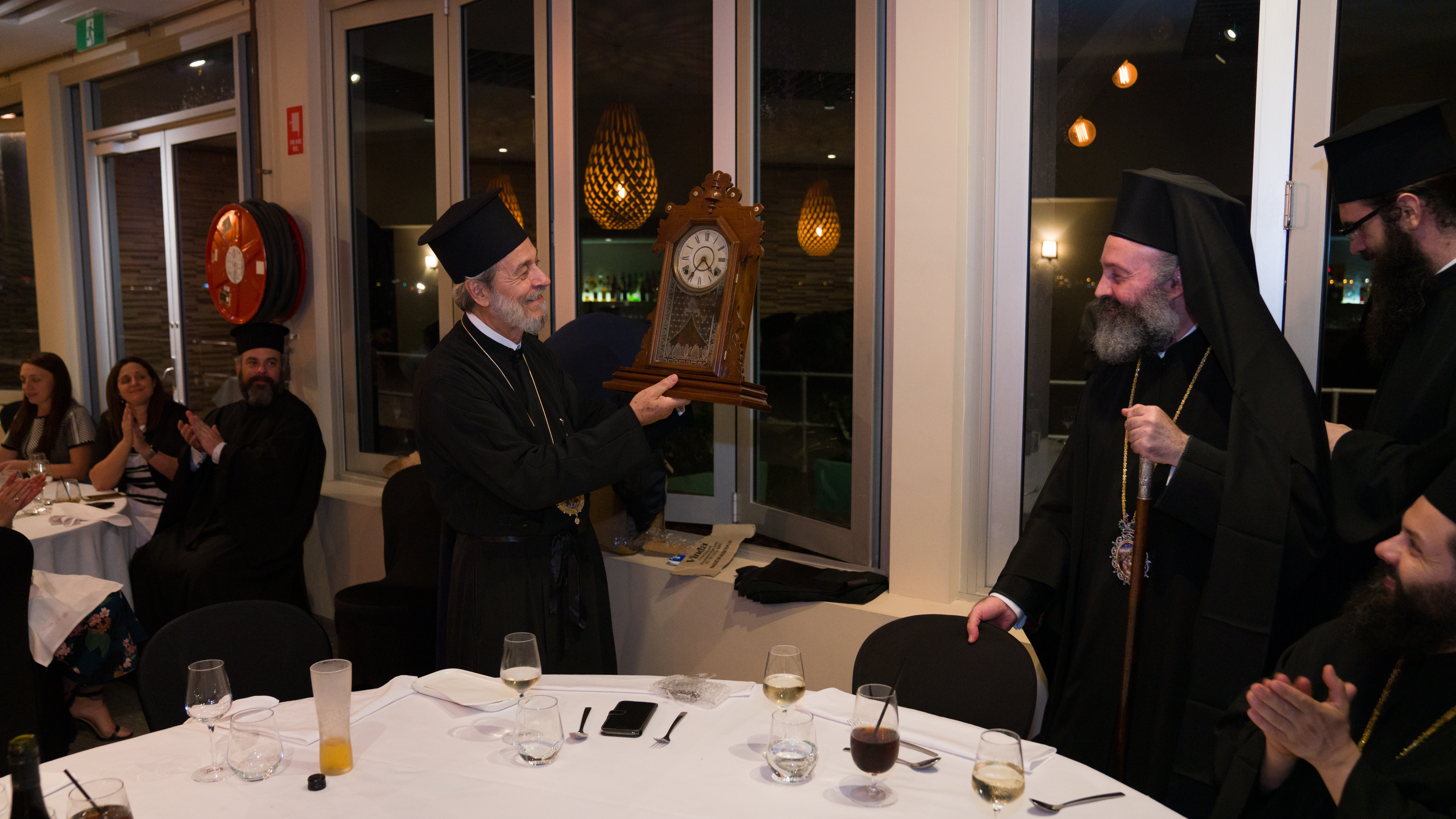 Στο δείπνο παρακάθισαν όλοι η κληρικοί και οι πρεσβυτέρες της Αρχιεπισκοπικής Περιφέρειας του Σύδνεϋ, οι οποίοι ευχήθηκαν έτη πολλά στον εορτάζοντα Μητροπολίτη, ενώ του επιφύλαξαν ένα ξεχωριστό δώρο, που ήταν ένα ρολόι αντίκα.