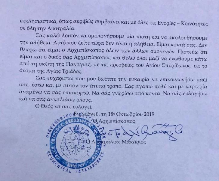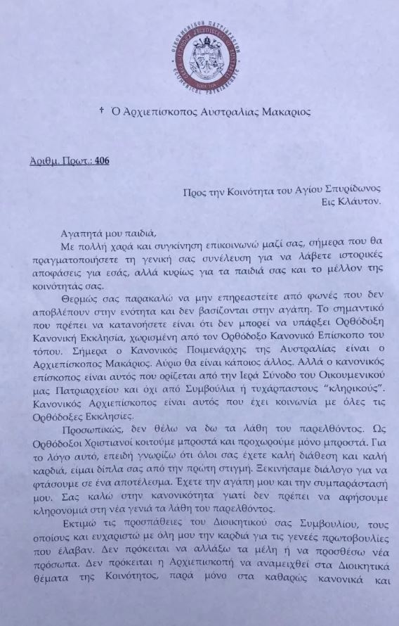 Ο Αρχιεπίσκοπος Αυστραλίας Μακάριος είχε στείλει προς τα μέλη της Κοινότητας την ακόλουθη επιστολή: