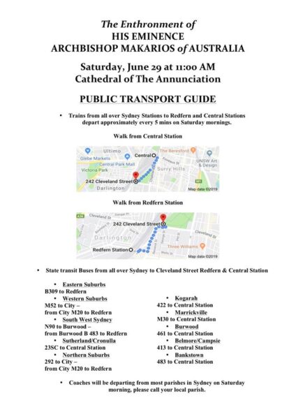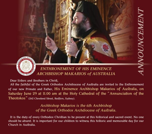 Πληροφορίες σχετικά με την ενθρόνιση του νέου Αρχιεπισκόπου Αυστραλίας, κ. Μακαρίου, στις 11:00 π.μ., κατά το ερχόμενο Σάββατο 29 Ιουνίου 2019 – Information regarding the Enthronement of His Eminence Archbishop Makarios Primate of the Greek Orthodox Archdiocese of Australia, at 11:00am this Saturday 29-6-2019.