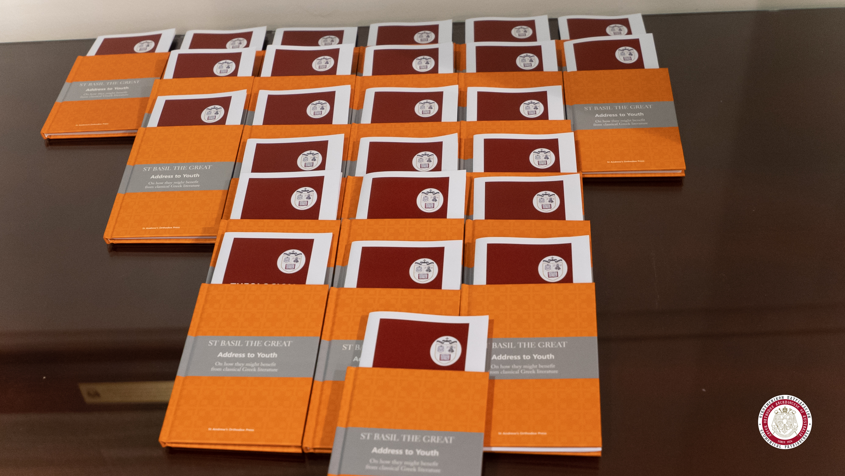 Στο τέλος της εκδήλωσης ο Σεβασμιώτατος Αρχιεπίσκοπος κ. κ. Μακάριος προσέφερε ως δώρο σε όλους τους παρευρισκόμενους από ένα βιβλίο για τον Μέγα Βασίλειο, με τίτλο “Προς τους Νέους”, το οποίο έχει εκδώσει ο Εκδοτικός Οίκος “St Andrew’s Orthodox Press” της Θεολογικής Σχολής του Αποστόλου Ανδρέου.