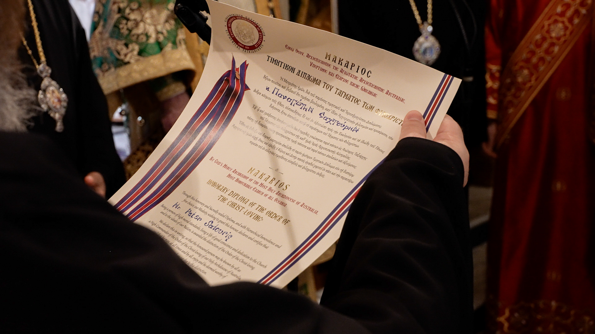 Διπλά χαρμόσυνη ήταν η ατμόσφαιρα το πρωί του Σαββάτου, 26 Δεκεμβρίου, στον Ιερό Καθεδρικό Ναό του Ευαγγελισμού της Θεοτόκου, κατά τη Θεία Λειτουργία επί τη εορτή της Συνάξεως της Υπεραγίας Θεοτόκου. Ο ένας λόγος ήταν η εις Διάκονον χειροτονία ενός ευσεβούς και αξίου νέου, του π. Αστερίου Ζουριάκα. Ο δεύτερος, η απονομή του παρασήμου του Τάγματος των Φιλοχρίστων σε ένα εξαίρετο μέλος της Ομογένειας και της Αυστραλιανής κοινωνίας, στον κ. Παναγιώτη Σαχτούρη.