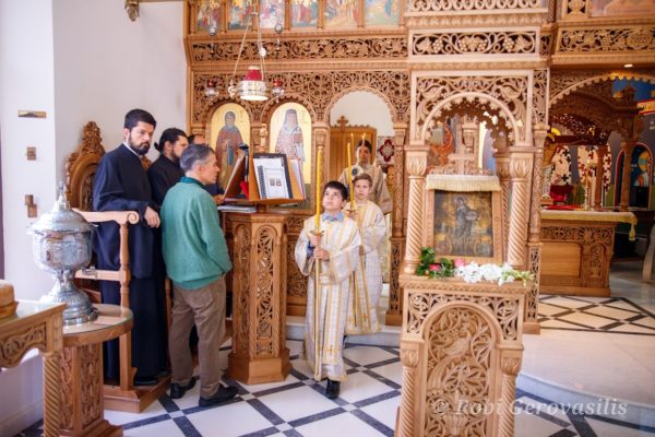 Στο τέλος της Ακολουθίας, ο Θεοφιλέστατος κ. Ελπίδιος, συνοδευόμενος από τον Ηγούμενο της Μονής, θαύμασε τα έργα που ολοκληρώθηκαν πρόσφατα στο Ιερό της εκκλησίας, τα οποία περιελάμβαναν την εγκατάσταση νέων ξύλινων ντουλαπιών για τη φύλαξη λειτουργικών αντικειμένων.