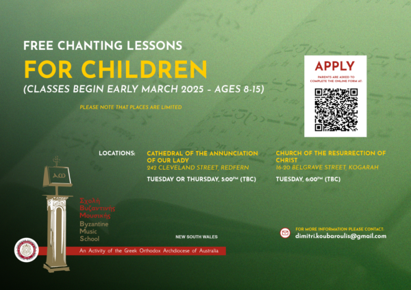 Με την ευλογία του Σεβασμιωτάτου Αρχιεπισκόπου Αυστραλίας κ. Μακαρίου, το Παράρτημα της Σχολής στη Νέα Νότιο Ουαλία, με έδρα το Σύδνεϋ, προετοιμάζεται για το νέο ακαδημαϊκό έτος 2025, κατά το οποίο θα προσφέρει μαθήματα βυζαντινής μουσικής: α) σε αγόρια και κορίτσια ηλικίας 8 έως 15 ετών, και β) σε νέους/ες άνω των 16 ετών και ενήλικες.