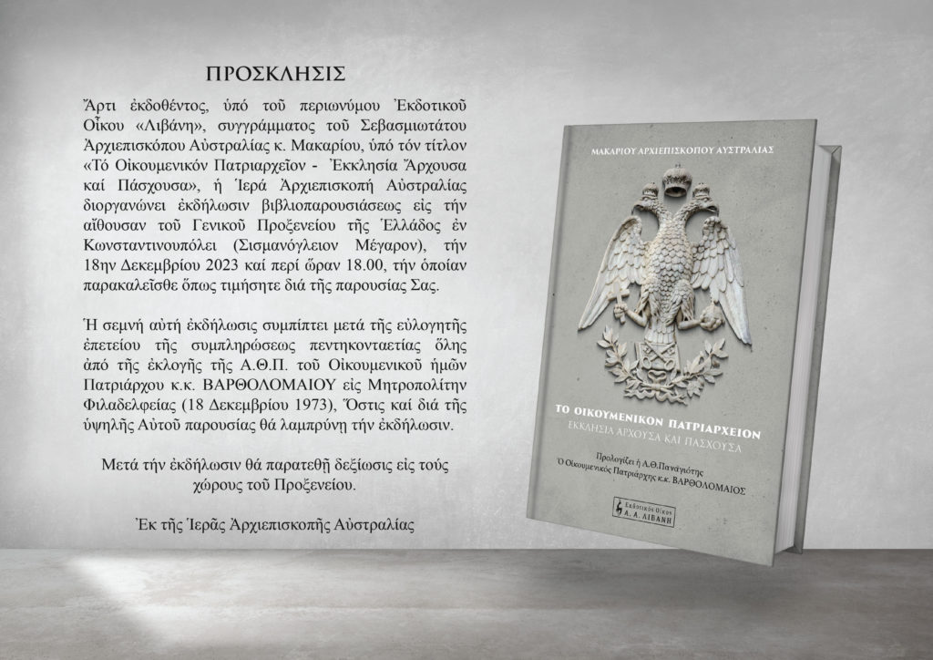 Κυκλοφόρησε, από τον γνωστό και ιστορικό Εκδοτικό Οίκο «Λιβάνη», το νέο βιβλίο του Σεβασμιωτάτου Αρχιεπισκόπου Αυστραλίας κ. Μακαρίου με τίτλο: «Το Οικουμενικόν Πατριαρχείον – Εκκλησία Άρχουσα και Πάσχουσα», το οποίο προλογίζει η Α.Θ. Παναγιότης, ο Οικουμενικός Πατριάρχης κ.κ. Βαρθολομαίος.