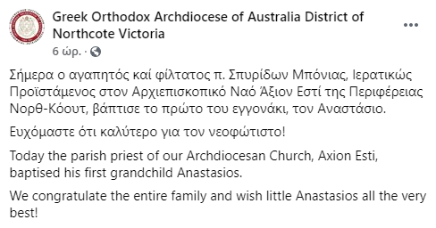Την Κυριακή της Απόκρεω, ο αγαπητός π. Σπυρίδων Μπόνιας, Ιερατικώς Προϊστάμενος στον Αρχιεπισκοπικό Ναό Άξιον Εστί της Περιφέρειας Νορθ-Κόουτ της Ιεράς Αρχιεπισκοπής Αυστραλίας, βάπτισε το πρώτο του εγγονάκι, τον Αναστάσιο. Οι πάντες ευχήθηκαν ό,τι καλύτερο για τον νεοφώτιστο.