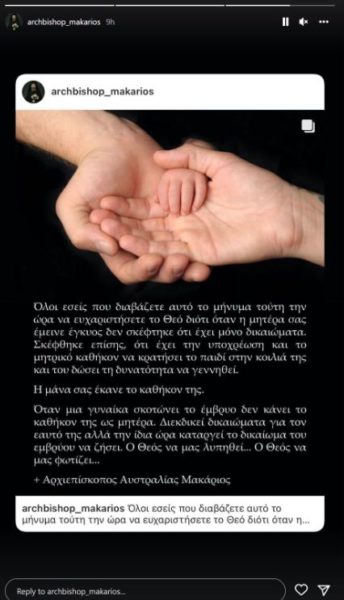 Βαρυσήμαντη δήλωση με αφορμή τη συζήτηση που διεξάγεται τις τελευταίες ημέρες για τις εκτρώσεις, κυρίως μετά την πρόσφατη απόφαση του Ανωτάτου Δικαστηρίου των Ηνωμένων Πολιτειών Αμερικής, έκανε με μήνυμα του ο Αρχιεπίσκοπος Αυστραλίας κ. Μακάριος.