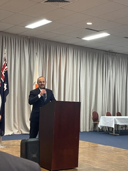 Ο Θεοφιλέστατος μετέφερε την αγάπη και τις ευλογίες του Σεβασμιωτάτου Αρχιεπισκόπου Αυστραλίας κ. Μακαρίου και καλωσόρισε στη Βρισβάνη, εκ μέρους του Σεβασμιωτάτου, τον κ. Ανδρέα Γρηγορίου, Γενικό Διευθυντή του Υπουργείου Γεωργίας, Αγροτικής Ανάπτυξης και Περιβάλλοντος και Προϊστάμενο Διοίκησης της Κυπριακής Προεδρίας, εκπρόσωπο του Προέδρου της Κυπριακής Δημοκρατίας.