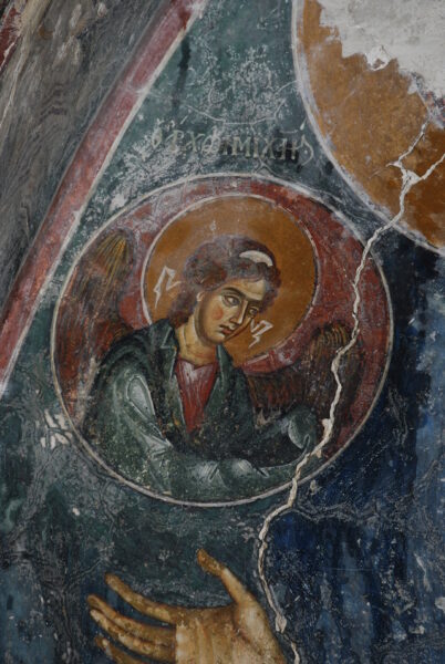 Πιο χαμηλά έχουμε μόνον μεμονωμένες μορφές σε δύο ζώνες: μία ζώνη μεταλλίων εκτός του ιερού Βήματος και την ζώνη των ολόσωμων μορφών, ανάμεσα στις οποίες ξεχωρίζει μία σπάνια σύνθεση. Πρόκειται για την απεικόνιση της Θεοτόκου που προσάγει τον μικρό Χριστό ως μαθητή στον Πρόδρομο. Η ίδια παράσταση έχει εντοπιστεί και στον ναό του Αγίου Αντωνίου στον οικισμό Κουτσουρά Ιεράπετρας. Οι τοιχογραφίες έχουν χρονολογηθεί γύρω στο 1300 και πάντως πριν την δεύτερη δεκαετία του 14ου αι. (Μαδεράκης 1994, 24-25).