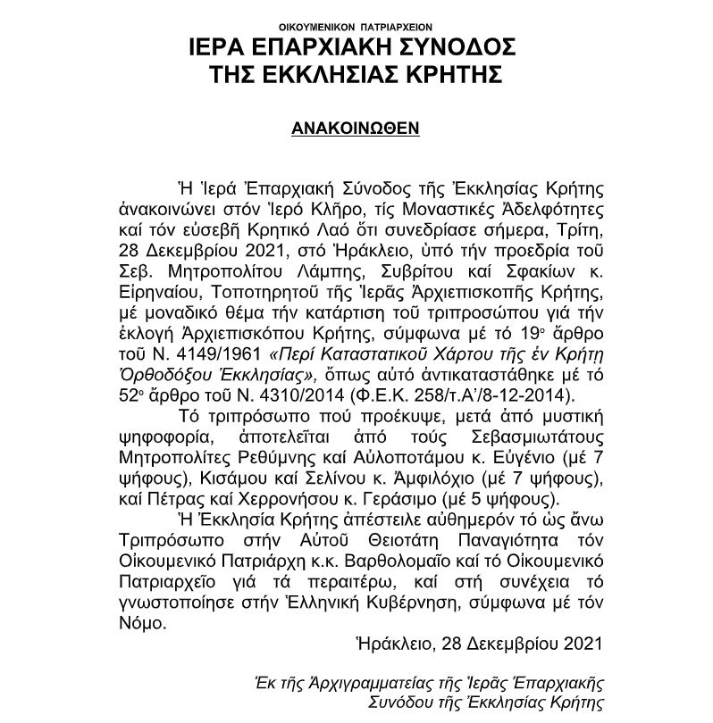 Ἡ Ἱερά Ἐπαρχιακή Σύνοδος τῆς Ἐκκλησίας Κρήτης ἀνακοινώνει στόν Ἱερό Κλῆρο, τίς Μοναστικές Ἀδελφότητες καί τόν εὐσεβῆ Κρητικό Λαό ὅτι συνεδρίασε σήμερα, Τρίτη, 28 Δεκεμβρίου 2021, στό Ἡράκλειο, ὑπό τήν προεδρία τοῦ Σεβ. Μητροπολίτου Λάμπης, Συβρίτου καί Σφακίων κ. Εἰρηναίου, Τοποτηρητοῦ τῆς Ἱερᾶς Ἀρχιεπισκοπῆς Κρήτης, μέ μοναδικό θέμα τήν κατάρτιση τοῦ τριπροσώπου γιά τήν ἐκλογή Ἀρχιεπισκόπου Κρήτης, σύμφωνα μέ τό 19ο ἄρθρο τοῦ Ν. 4149/1961 «Περί Καταστατικοῦ Χάρτου τῆς ἐν Κρήτῃ Ὀρθοδόξου Ἐκκλησίας», ὅπως αὐτό ἀντικαταστάθηκε μέ τό 52ο ἄρθρο τοῦ Ν. 4310/2014 (Φ.Ε.Κ. 258/τ.Α’/8-12-2014).