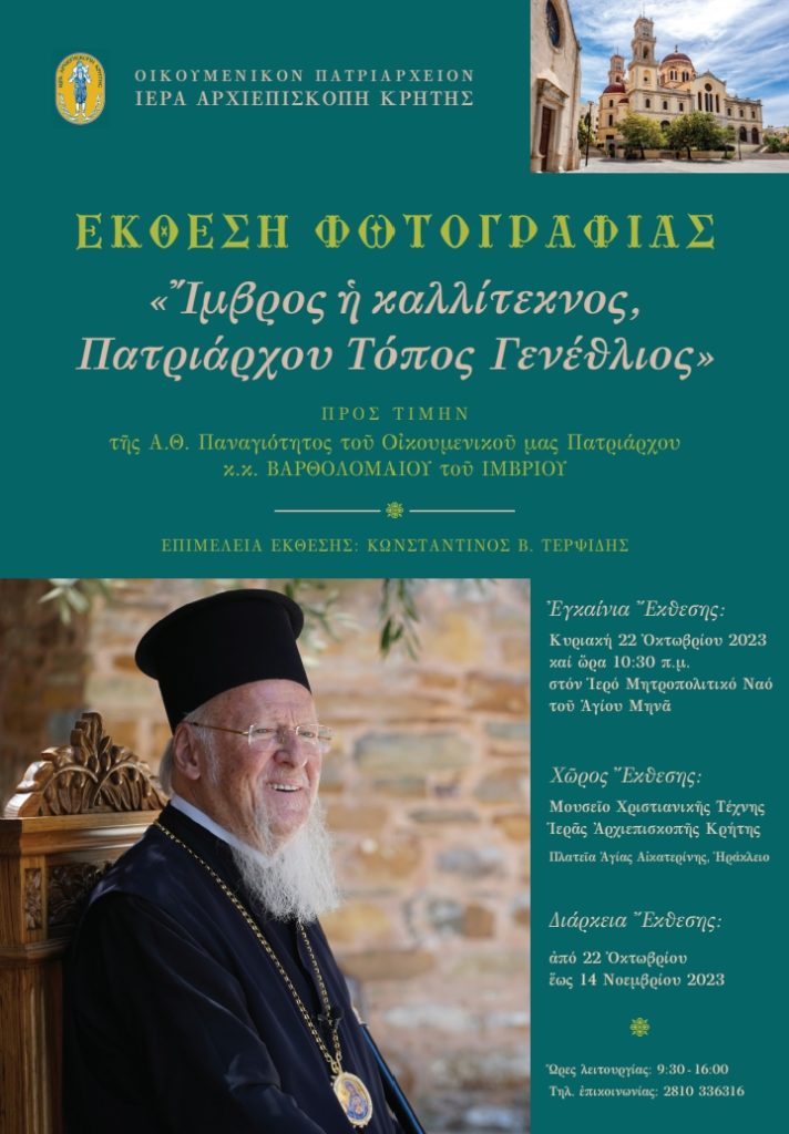 Την Κυριακή 22 Οκτωβρίου 2023 και ώρα 10.30 π.μ. θα πραγματοποιηθούν τα εγκαίνια έκθεσης φωτογραφίας προς τιμήν της Α. Θ. Π. του Οικουμενικού Πατριάρχου κ.κ. Βαρθολομαίου του Ιμβρίου, με τίτλο « Ίμβρος η καλλίτεκνος Πατριάρχου Τόπος Γενέθλιος», υπό την αιγίδα του Σεβασμιωτάτου Αρχιεπισκόπου Κρήτης κ. Ευγενίου.