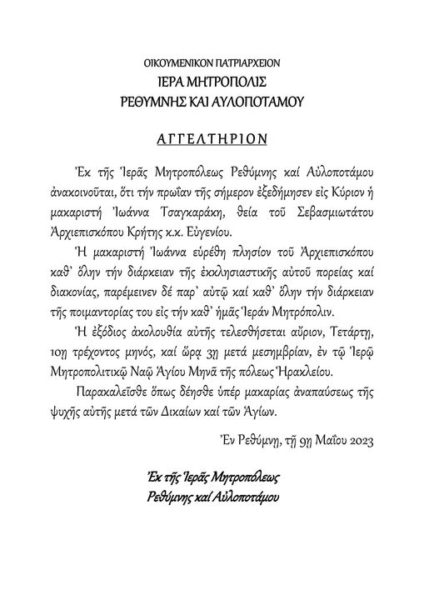 Εξεδήμησε εις Κύριον η μακαριστή Ιωάννα Τσαγκαράκη, θεία του Σεβασμιωτάτου Αρχιεπισκόπου Κρήτης κ. Ευγενίου.
